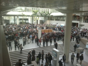 Il y avait beaucoup de monde dans le grand hall du bâtiment central du Technocentre, appelé La Ruche, aujourd’hui à midi lors de la minute de silence appelée par la direction de Renault “en mémoire des personnes victimes des attentats commis le 13 novembre à Paris”.